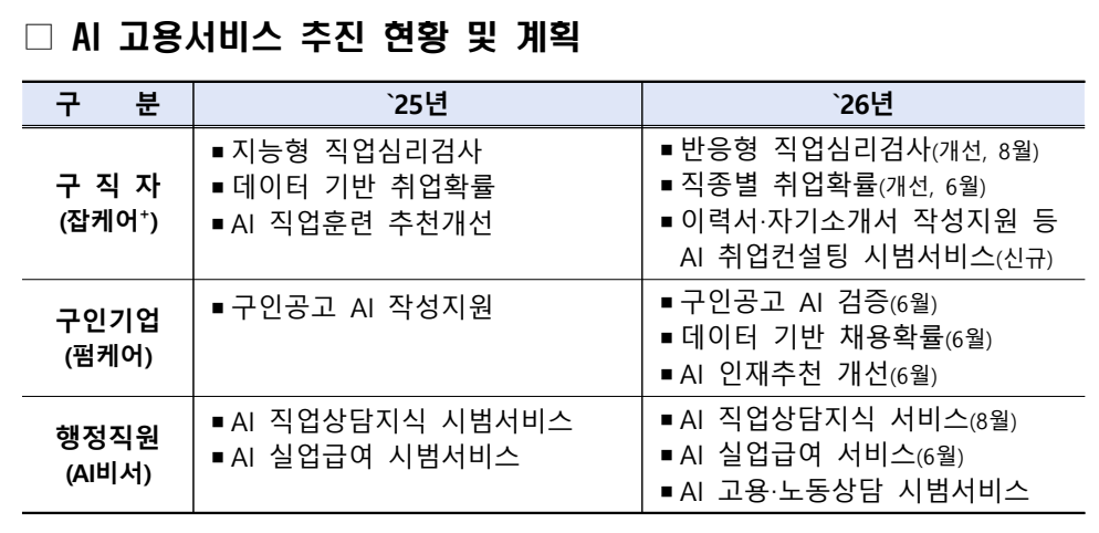 나아가 고용24와 국가일자리정보플랫폼을 연계한 AI 기반의 고용서비스도 새롭게 도입되며 미래형 행정으로의 전환을 준비하고 있다. 오는 2026년에는 구직자를 대상으로 하는 AI 이력서·자기소개서 컨설팅은 물론, 기업을 대상으로는 채용 확률에 기반한 매칭 분석 서비스가 새롭게 제공될 계획이다. 특히 청년 데이터베이스를 확충하고 지역, 직종, 진로 유형별 자동 추천 프로그램을 운영하여 '쉬었음 청년' 등 정책적 사각지대에 놓인 인력에 대한 지원을 강화할 예정이다. 또한 고용보험, 직업훈련, 자격 정보 등 핵심 고용데이터가 공공마이데이터 방식으로 개방되면서 민간 취업포털이나 대학일자리플러스센터 등에서도 이를 조회하고 활용할 수 있게 된다. 기존 정형데이터 중심의 시스템을 넘어 비정형 및 반정형 데이터를 처리하는 AI 데이터 레이크 구축 역시 본격적으로 추진되어 고용 행정의 디지털 전환에 속도가 붙을 전망이다.