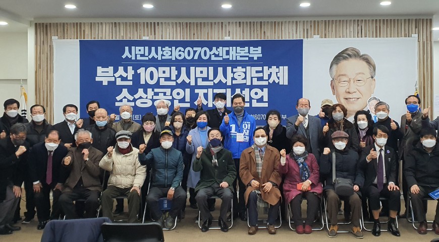 (에듀온라이프뉴스)조한성=더불어민주당 부산 대전환 톱니바퀴 선거대책위원회에서는 26일 토요일 11시 부산시당 2층 대강당에서 시민사회6070선대본부의 부산10만 시민사회단체 소상공인이 지지선언을 하였다. [부산10만 시…