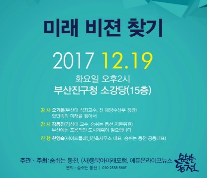 (에듀온라이프뉴스) 편집부= 숨쉬는 동천, (사)동북아미래포럼, 에듀온라이프뉴스 주관으로 19일 부산진구청 소강당에서 '미래비젼찾기'란 주제로 강연회를 개최한다. 이번 강연회는 오거돈 전 해양수산부 장관과 …