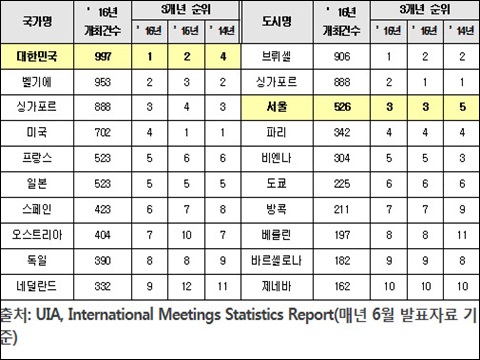 한국이 국제협회연합(UIA) 집계에서 작년 국제회의 개최 순위 세계 1위를 기록했다.문화체육관광부와 한국관광공사는 매년 세계 국제회의 통계를 공식적으로 발표하고 있는 국제협회연합(UIA)의 2016년 세계 국제회의 개최 순위를…
