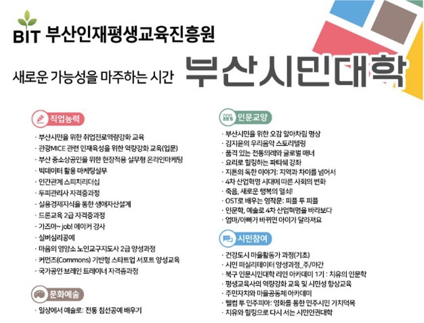 (에듀온라이프뉴스) 박정순=부산시민이 대학 수준의 질 높은 교육을 받고 성장할 수 있도록 지원하기 위한 ‘2019년 부산시민대학’ 프로그램을 개강한다. 부산시민대학은 부산시민 누구나 대학수준의 교육을 듣고…