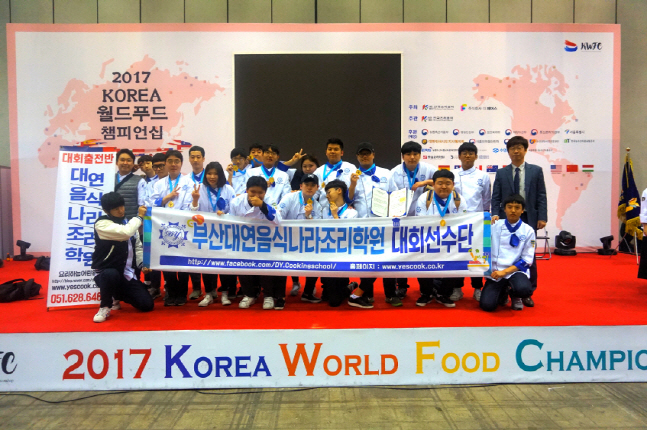 △ 2017코리아월드푸드챔피언십에서 부산대연음식나라조리학원의 대회출전 15명이 전원 금메달을 수상하고 기념촬영을 하고 있다. 부산요리학원, 부산대연음식나라조리학원 대회출전반 '2017 KOREA 월드푸드 챔…