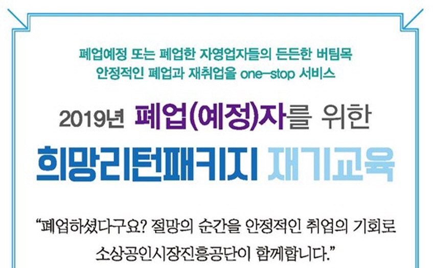 (에듀온라이프뉴스)이명철=소상공인시장진흥공단이 운영하는 ‘희망리턴패키지’는 폐업의 기로에 서 있으면서 취업 의지가 있는 소상공인들에게 재기의 기회를 제공하는 사업으로, 폐업 단계부터 이후 단계까지 전 과…