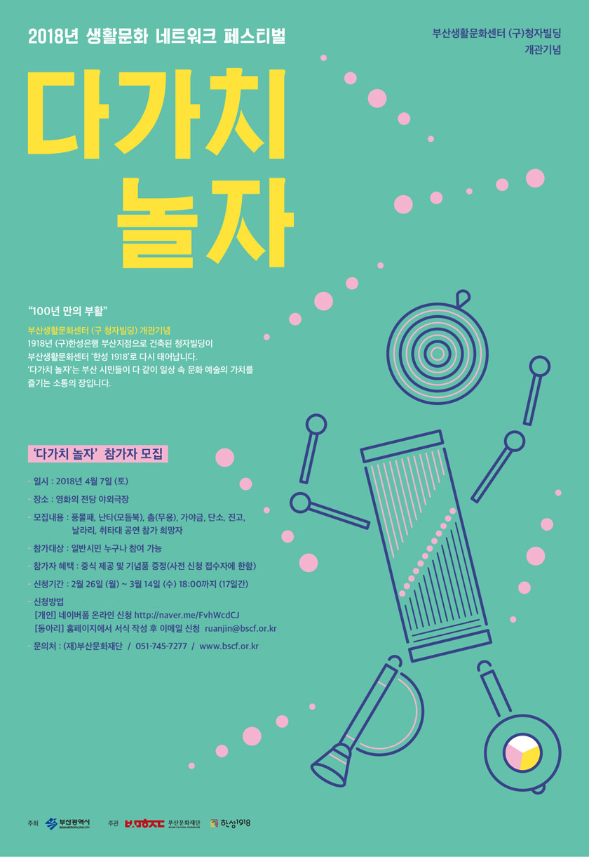 (에듀온라이프뉴스)이명철=(재)부산문화재단(대표이사 유종목)은 오는 4월 7일(토) 영화의 전당 야외극장에서 개최되는 2018 생활문화 네트워크 페스티벌 ‘다가치 놀자’의 행사 참가자를 모집한다고 밝혔다. …